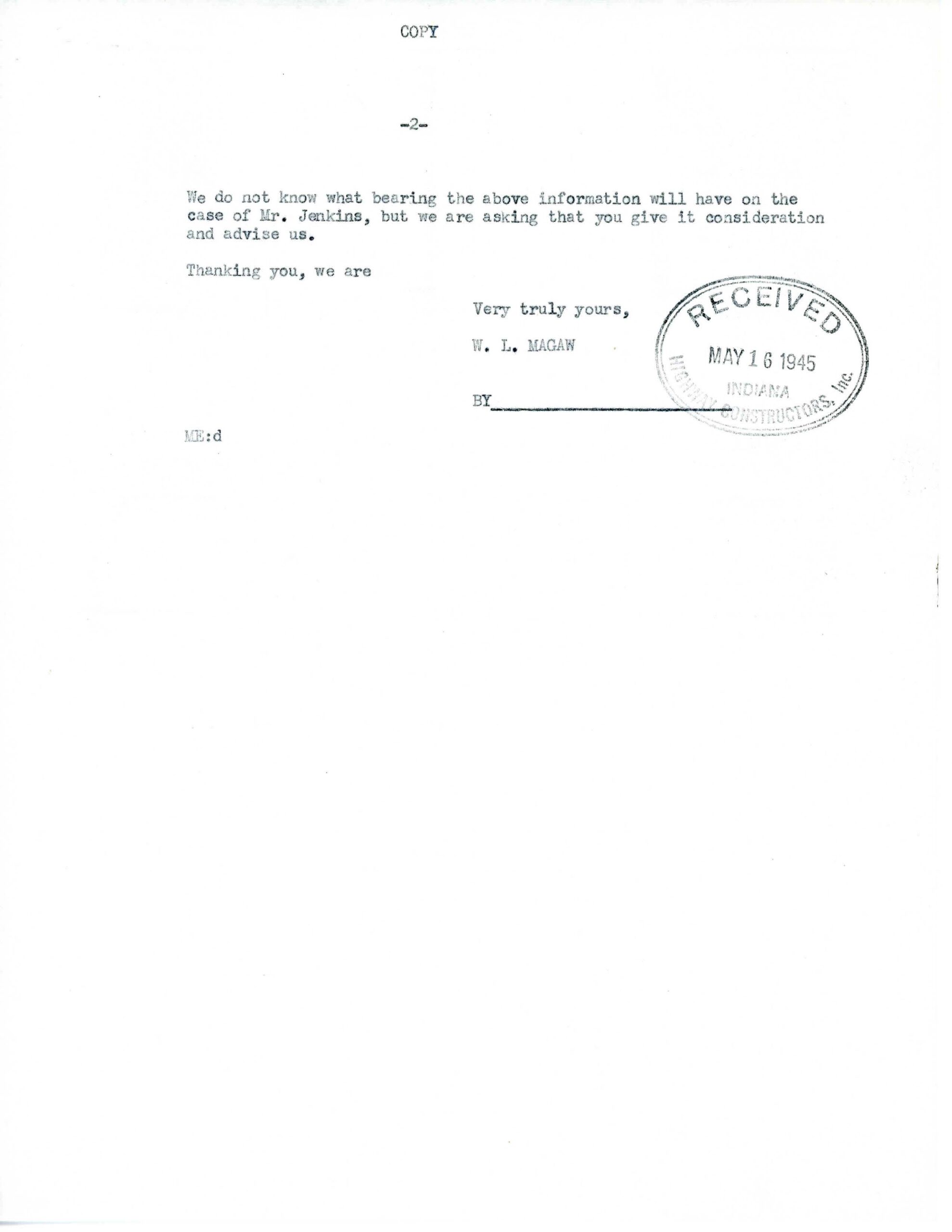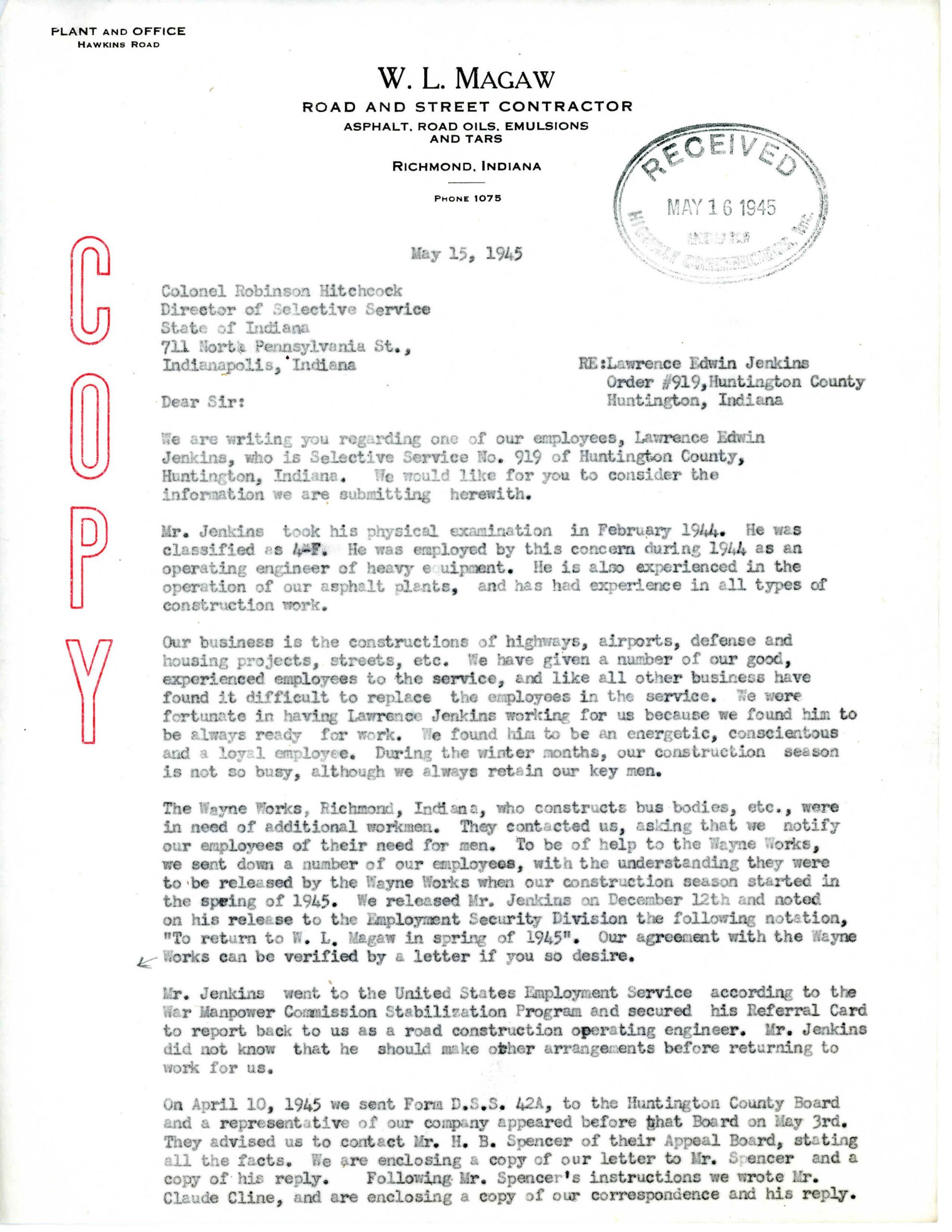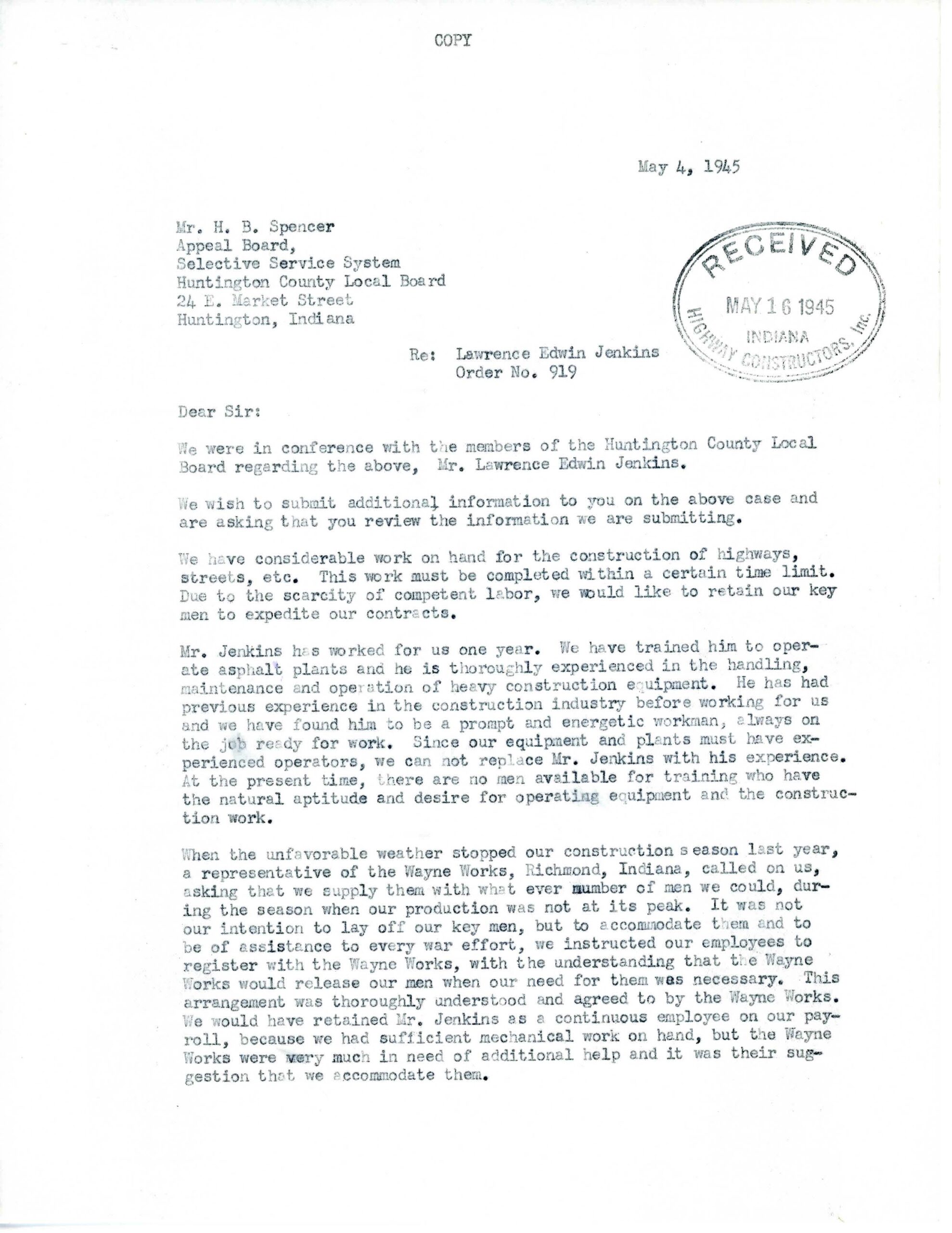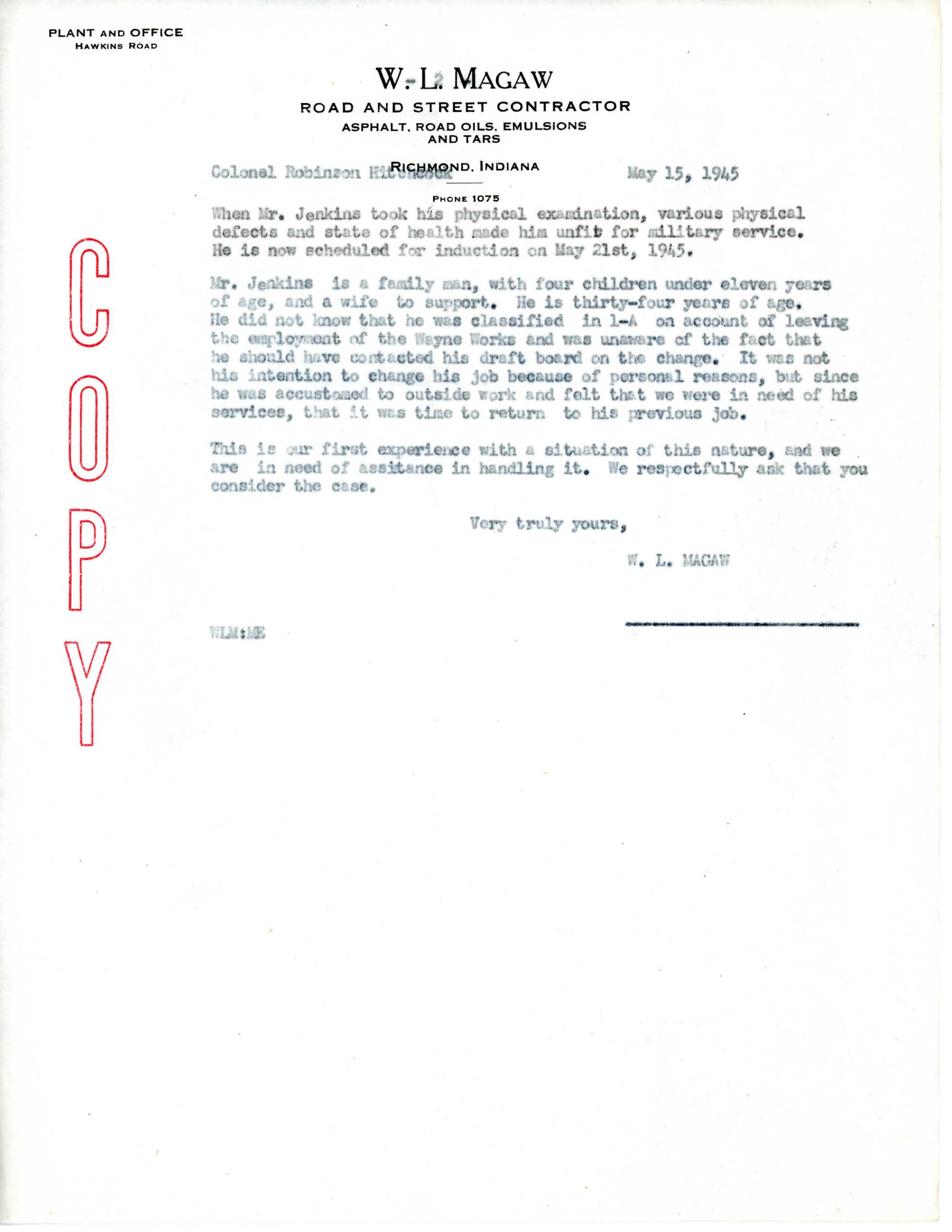 However, once he returned to Magaw Construction in April 1945, Jenkins received a draft notice. He was scheduled for induction on May 21, 1945.